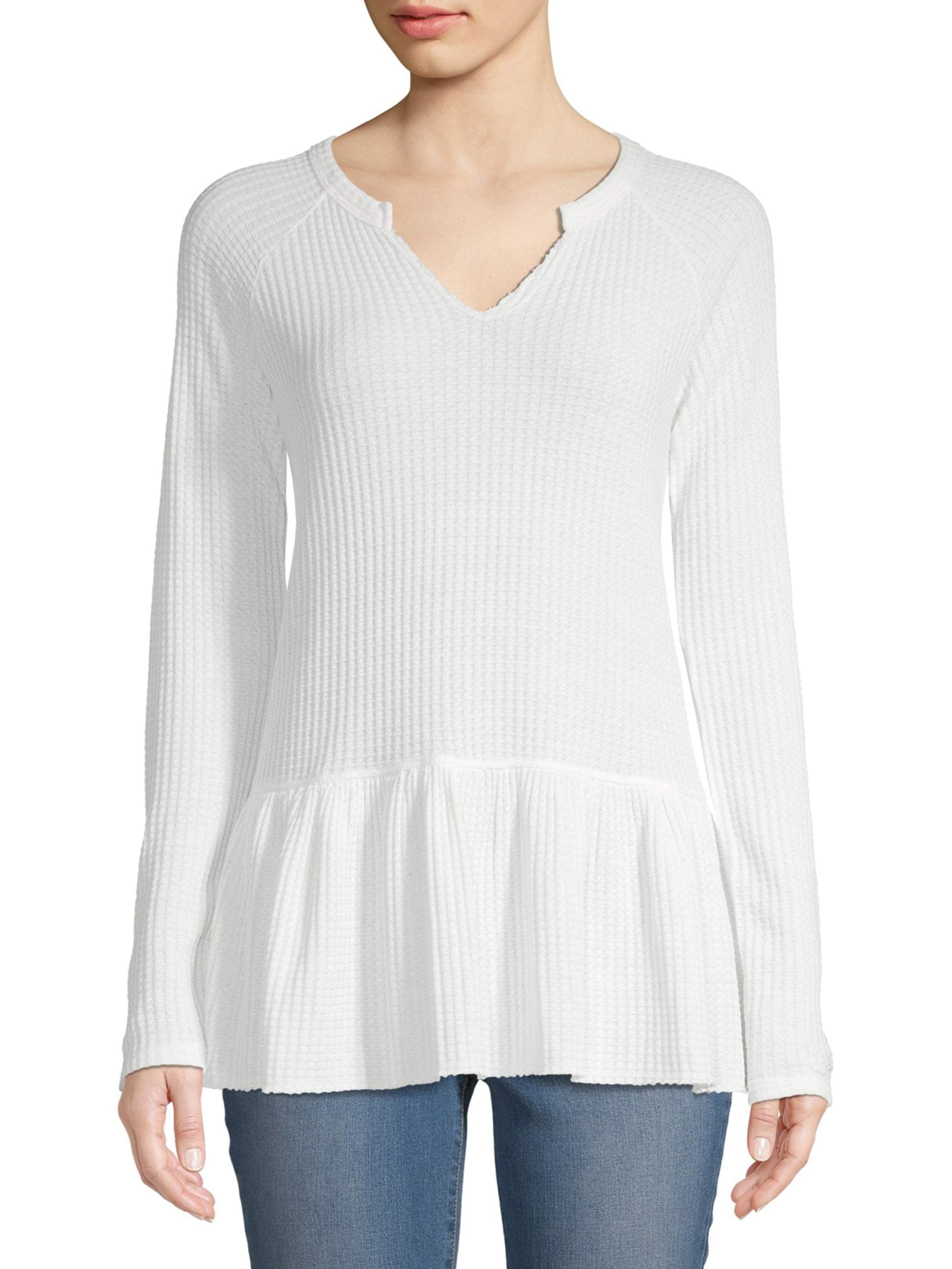 Time and Trus peplum hem thermal top puts a different spin on your jeans and tee look. Cozy sweet and ready for fall this soft waffle-knit thermal top is made of 100 cotton with faux wood buttons and a ruffle peplum hem. Machine wash cold with like colorsgentle cycleonly non-chlorine bleach if neededtumble dry lowcool iron if necessary.